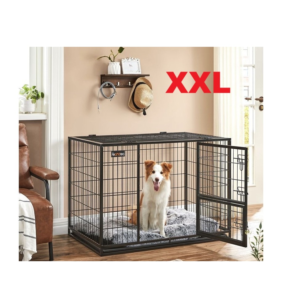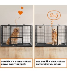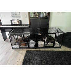 Domácí masivní kotec velikosti ,,XXL" na psa do bytu či domu z lakované kvalitní oceli bez ostrých hran. Možné použít i jako transportní box. Dvoje přední samostatně otevírací dvířka jsou zabezpečeny čtyřmi západkami ve tvaru L. Spodní dvířka dobře poslouží pro krmení, aby zvíře neuteklo. Podlahu boxu je možné jednoduše vysunout a tak snadno a hygienicky vyčistit či omýt vodou. Kotec má otevírací hodní víko pro lepší interakci se psem, poslouží tedy dobře i jako ohrádka. Kotec je vyroben v Německu což zaručuje kvalitní provedení výrobku.