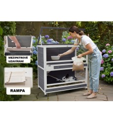 Kvalitní designová dvoupatrová propojená dřevěná králíkárna vhodná jak do domu tak ven. Nabízí opravdový komfort pro vaše zvířata. Propojení je zajištěno pomocí dřevěné rampy. Propojení jde uzavřít pomocí sklopných dvířek, zvířata tak mohou zůstat oddělená. Nabízí dostatek čerstvého vzduchu. Kvalitní silné mříže chrání před predátory a zabrání prokousnutí. Králíkárna obsahuje v každém patře jedny velká dvířka v kovové mříži. Další vstup do králíkárny je ze shora, kdy jde celé horní víko odklopit a dostat se tak dovnitř. Krmení nebo vodu tedy můžete jednoduše dát do králíkárny. Dostanete se pohodlně do každého zákoutí. Králíkárna je postavena na 4 bržděných kolečkách, která zajištuje pohodlné přemístění.