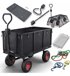 3 890,00 CZK 6 690,00 CZKVysokokvalitný pevný vozík s nosnosťou 650 kg, vhodný na všestranné použitie. V záhrade aj na cestách. Vydrží prepravu ťažších nákladov. Rozmery: šírka 115 cm, hĺbka 52 cm, výška 105 cm. Veľké nafukovacie kolesá s priemerom približne 26 cm.