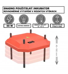 Doska je výškovo nastaviteľná, čo umožňuje jej prispôsobenie rôznym typom hydiny vrátane kurčiat, prepelíc a iných druhov zvierat. Nastavením ideálnej výšky im môžete zabezpečiť optimálnu klímu a chov. Vďaka integrovanému 50W regulátoru teploty od 10 do70 °C je ohrievacia doska mimoriadne energeticky účinná, čo je nielen ekologické, ale znižuje aj vaše náklady na energiu.