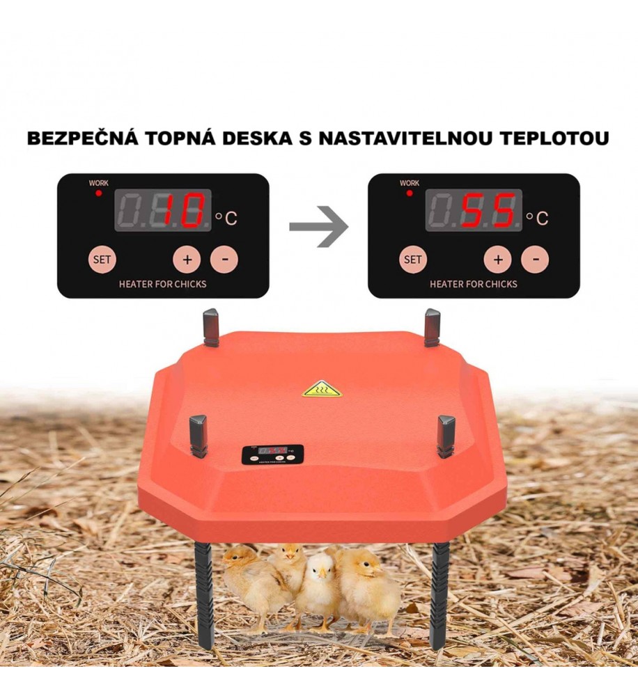 Doska je výškovo nastaviteľná, čo umožňuje jej prispôsobenie rôznym typom hydiny vrátane kurčiat, prepelíc a iných druhov zvierat. Nastavením ideálnej výšky im môžete zabezpečiť optimálnu klímu a chov. Vďaka integrovanému 50W regulátoru teploty od 10 do70 °C je ohrievacia doska mimoriadne energeticky účinná, čo je nielen ekologické, ale znižuje aj vaše náklady na energiu.