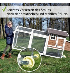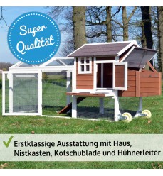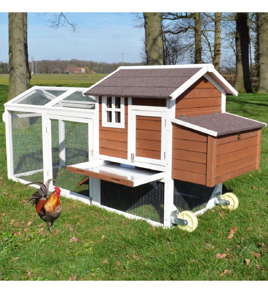S týmto kurníkom máte maximálnu flexibilitu, takže môžete sliepky premiestniť do tieňa na piesok alebo len na čerstvú trávu. Súčasťou kurína je rampa, po ktorej sa sliepky dostanú do kurína. Vchod sa uzatvára plátkom z vonkajšej strany, (takže nemusíte liezť do kurína, aby ste na noc uzavreli vchod pred dravcami). V domčeku sa nachádzajú dva rady kohútikov a výsuvná pozinkovaná zásuvka. Hniezdna búdka obsahuje dve samostatné hniezdne búdky. Výber vajec a ich čistenie zabezpečuje otváracia strecha hniezdnej búdky. Vonkajší výbeh má veľké dvere, ktoré umožňujú ľahký vstup alebo otvorenie, aby si zvieratá mohli užívať otvorenú záhradu.