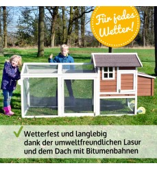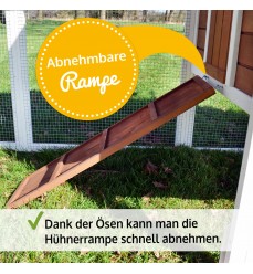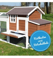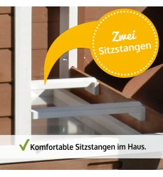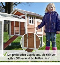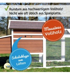 - ohrada vybavená silným pozinkovaným pletivom v ráme - natretá ekologickým a netoxickým lakom - rýchle čistenie vďaka výsuvnej kovovej zásuvke - čistenie hniezda jejednoduché - otváranie strechy zhora a jednoduchý zber vajec