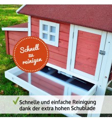 Celý kurník je vybavený pozinkovanými uzávermi, kvalitnou strechou zo švédskeho šindľa, ktorá chráni pred vlhkosťou, dažďom a krupobitím. Praktická pozinkovaná posuvná zásuvka na trus, vďaka ktorej je zaručené hygienické a jednoduché čistenie.