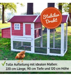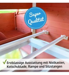 Hniezdny box je vybavený drevenou prepážkou a je tak rozdelený na dva samostatné koše. Box má otváraciu strechu, ktorá zaručuje jednoduché čistenie a výber vajec zvonku. K dispozícii sú aj dve drevené hniezda oválneho tvaru na odpočinok a spanie sliepok. Z kurína vedie rampa do veľkého výbehu a posuvné dvere do výbehu, ktoré sa dajú zvonku ľubovoľne zatvoriť kovovým posúvačom na ochranu sliepok pred dravcami v noci. Celý kurník je vyvýšený, čo zabraňuje prechladnutiu a premrznutiu spodnej časti kurníka.