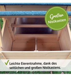 Hniezdny box má rozmery približne 55 x 35 cm a dá sa otvoriť cez strechu, aby ste mohli ľahko vybrať vajcia. Mimochodom, v novopostavenom kurníku má zmysel umiestniť niekoľko vajec do hniezdnej búdky zo sadry, aby si sliepky uvedomili, že hniezdna búdka je miestom na uskladnenie vajec.