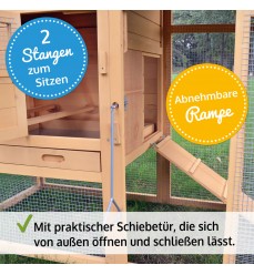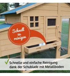 Kurník má stabilnú konštrukciu, je vybavený kohútikmi, ktoré poskytujú zvieratám tiché a pohodlné miesto na spanie. Jeho súčasťou je kovová zásuvka s výsuvom na exkrementy. To umožňuje rýchle a jednoduché čistenie. Dno zásuvky je vybavené pozinkovaným plechom.