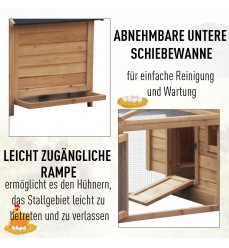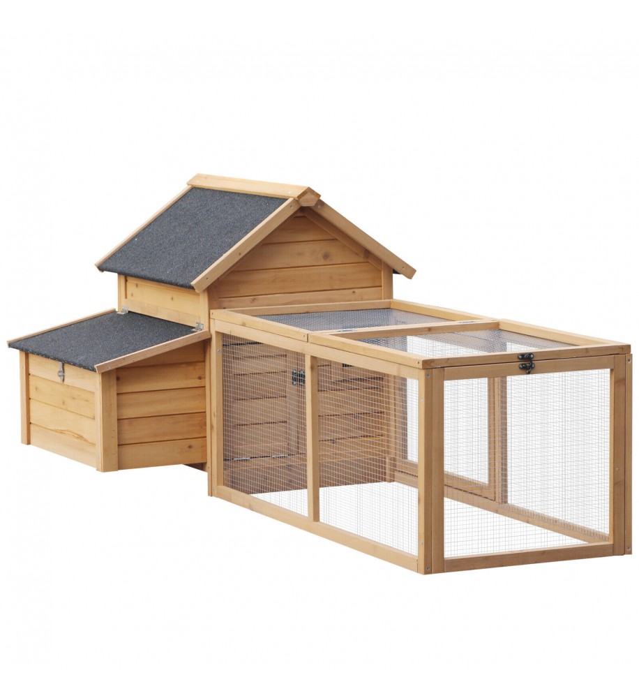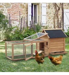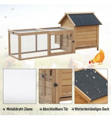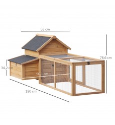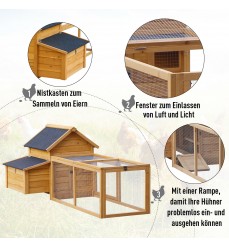 Kurník s hniezdom z jedľového dreva 180 x 90 x 80 cm. Vhodný pre 4 - 5 sliepok. Kurník má vyvýšený hniezdny box a priestranný výbeh. Hniezdo má výklopnú strechu, takže k nemu máte ľahký prístup na zber vajec. Pred poveternostnými vplyvmi ho chráni asfaltová strecha proti UV žiareniu.