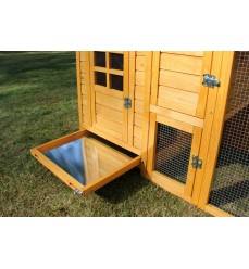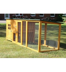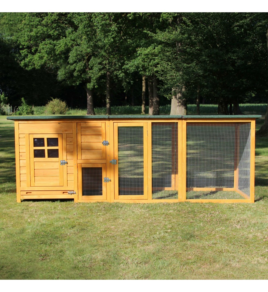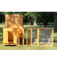 Výhody: - flexibilný variant - veľký výbeh s možnosťou rozšírenia - vyrobený z kvalitného borovicového dreva - odolný voči poveternostným vplyvom - praktická zásuvka na trus s pozinkovaným plechom - kvalitné spracovanie - strecha nad výbehom - pohodlné čistenie