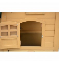 Zaoblené dvere do kurína majú mriežkované okno. Nad dverami sa nachádza vetrací otvor s pozinkovanou mriežkou, ktorý sa otvára pomocou posúvača. Vo vnútri kurína nájdu vaše sliepky veľké oválne bidielko (hniezdo) na odpočinok a tiež prístup do výbehu cez ďalšie otváracie (sklopné) dvierka. Prístup do výbehu je možný aj zvonku cez sklopnú striešku, aby ste mohli vybrať znesené vajcia, vyčistiť ho alebo podať krmivo a vodu. Pri domčeku sa nachádza bočná hniezdna búdka na znášanie vajec, rozdelená na dva samostatné koše - na znášanie vajec. Má tiež otváraciu strechu na jednoduché čistenie a vyberanie vajec.