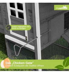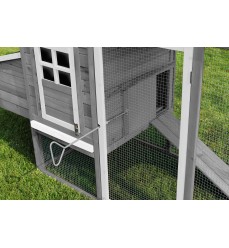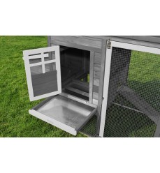 Výsuvné dno s pozinkovaným plechom umožňuje jednoduché a efektívne čistenie trusu. Jednoduchý prístup potom zabezpečujú dvierka. Všetky strešné prvky sú vďaka kvalitnému asfaltovému povrchu vodoodpudivé. Kurník je uzamykateľný zvonku vďaka kovovému posúvaču - zvieratá sú tak chránené pred predátormi.