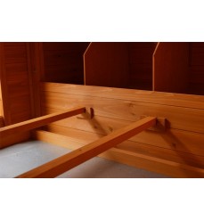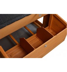 Na jednej strane po celej hĺbke kurína sa nachádza znáškový box, ktorý je rozdelený na tri samostatné znáškové hniezda, kde sa sliepky môžu striedať v hniezdení a znášaní vajec. Hniezdny box je výklopný, čo uľahčuje výber vajec aj čistenie. Na prednej strane je posuvný uzatvárateľný vetrací otvor, ktorý zabezpečuje nepretržitý prísun čerstvého vzduchu. V spodnej časti nájdete aj výsuvnú zásuvku na trus s pozinkovaným plechom na jednoduché a hygienické čistenie. Mriežku na trus možno vytiahnuť dozadu aj dopredu a čistiť ju zvonka. Predná a zadná strana obsahuje dvierka, cez ktoré môžu sliepky vyliezť von, buď na voľný výbeh do záhrady, alebo do výbehu, ktorý si môžete kúpiť (alebo vyrobiť vlastný). Kurník obsahuje rampu, ktorú tu umiestnite na ľubovoľnú stranu kurína, kde ju potrebujete.