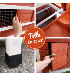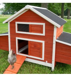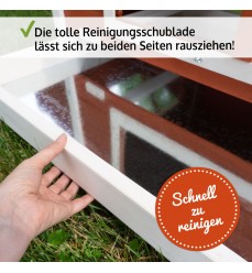 Na oboch stranách kurína sú hniezdne boxy, ktoré sú rozdelené na dve samostatné znáškové hniezda, takže kurín obsahuje celkovo 4 znáškové hniezda, kde sa sliepky môžu striedať v hniezdení a znášaní vajec. Hniezdne boxy sú sklopné, takže je ľahké vyberať vajcia aj ich čistiť. V prednej časti je posuvný uzatvárateľný vetrací otvor, ktorý zabezpečuje nepretržitý prísun čerstvého vzduchu. V spodnej časti nájdete aj výsuvnú zásuvku na trus s pozinkovaným plechom na jednoduché a hygienické čistenie. Mriežku na trus možno vytiahnuť dozadu aj dopredu a čistiť ju zvonku. Predná a zadná strana obsahujú posuvné dvierka, ktoré umožňujú sliepkam vyliezť von, buď na voľný výbeh do záhrady, alebo do výbehu, ktorý si môžete kúpiť (alebo vyrobiť vlastný). Súčasťou kurína je rampa, ktorú umiestnite na obe strany kurína tam, kde ju potrebujete.