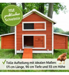 Rozmery jedného kurína: šírka 171 cm, hĺbka 90 cm, výška 113 cm. Rozmery jedného hniezdneho boxu: 80x40x40cm. Hmotnosť bez výbehu: približne 30 kg (spolu 2x kartón).