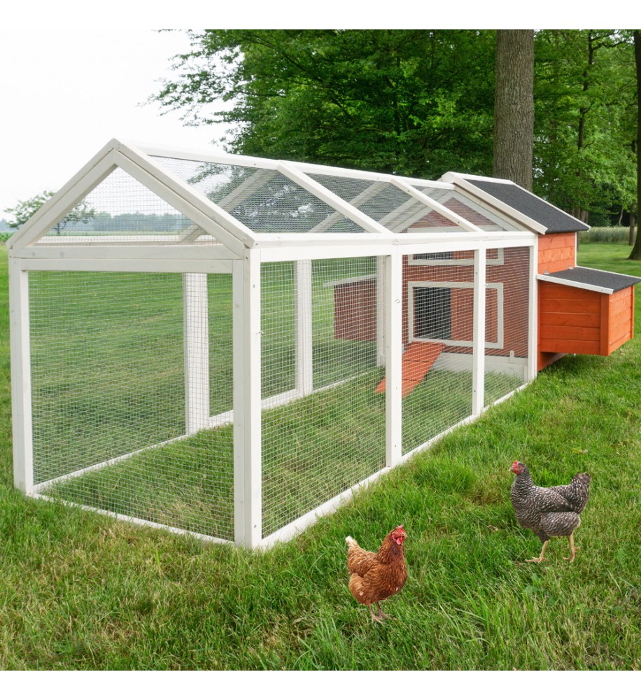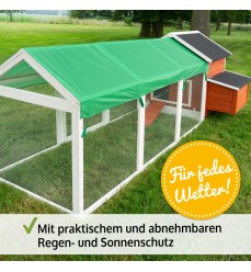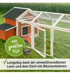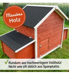 Strecha kurína je vyrobená z kvalitnej asfaltovej lepenky odolnej voči poveternostným vplyvom. Kurník je vyrobený z jedľového dreva spolu s materiálmi odolnými voči poveternostným vplyvom. Stojí na drevených nohách, aby sa zabránilo predčasnému zvetrávaniu zospodu. Sliepky sú tak lepšie chránené pred chladom a mrazom zo zeme. Jeho súčasťou sú aj dva kvalitné oválne kohútiky. Drevo je natreté nezávadným, ekologickým lakom.