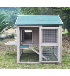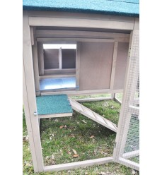 Do kurníka sa z výbehu vstupuje pomocou rampy. Celý kurník a výbeh je vyrobený z kvalitného vysušeného jedľového dreva a natretý lakom odolným voči poveternostným vplyvom a šetrným k životnému prostrediu. Pod kurníkom sa nachádza veľká výsuvná drevená zásuvka s pozinkovaným plechom, na ktorú padá trus, čím je zabezpečené jednoduché, rýchle a hygienické čistenie. V domčeku sú nainštalované aj drevené hniezda oválneho tvaru, na ktorých môžu sliepky odpočívať a spať. V prednej časti sa nachádzajú dvierka so zamrežovaným plastovým oknom, ktoré dodávajú kurníku na kráse. Dvere sa však dajú otvoriť, napríklad na čistenie alebo odchyt sliepok. V zadnej časti kurína sa nachádzajú malé posuvné dvierka, ktoré v prípade potreby zabezpečujú čerstvý vzduch (kvôli bezpečnosti sliepok majú pozinkované pletivo). Na bočnej strane kurína sa nachádza hniezdny box na znášku, ktorý sa dá otvoriť zvonku na vybratie vajec alebo na jeho vyčistenie. Box je rozdelený na 4 samostatné znáškové hniezda. Celá strecha je chránená proti vlhkosti, dažďu a slnku kvalitným švédskym šindľom. Všetky otváracie mechanizmy sú kovové a pozinkované.