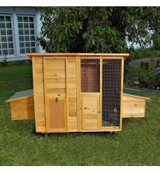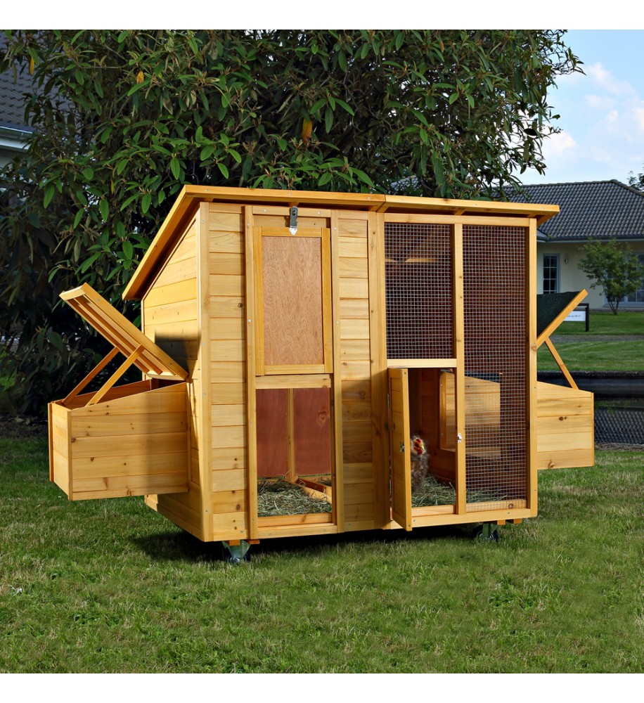 Krásny veľký mobilný kurník na kolieskach pre 9 - 11 sliepok z kvalitného jedľového dreva s možnosťou pripojenia výbehu. Rozmery: šírka 215 cm, hĺbka 110 cm, výška 125 cm. Vhodný pre sliepky, kurčatá, bantamy, kačice, prepelice, králiky alebo mačky.