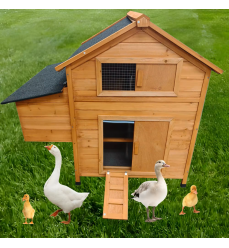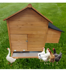 Strecha kurína je vyrobená z kvalitnej asfaltovej lepenky odolnej voči poveternostným vplyvom. Kurník je vyrobený z jedľového dreva spolu s materiálmi odolnými voči poveternostným vplyvom. Stojí na drevených nohách, aby sa zabránilo predčasnému zvetrávaniu zospodu. Sliepky sú tak lepšie chránené pred chladom a mrazom zo zeme. Jeho súčasťou sú aj dva kvalitné oválne kohútiky. Drevo je natreté nezávadným, ekologickým lakom.
