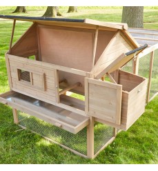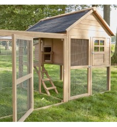 Nádherný kurník Tirana s ohradou, ktorá vašim sliepkam ponúka skutočne obrovský výbeh. Nielenže krásne vyzerá, ale je aj naozaj kvalitne spracovaný a premyslený. Je vhodný pre približne 7 - 8 sliepok. Priestor pod kurníkom a po jeho stranách slúži ako vonkajší výbeh, kde majú vaše sliepky priestor na pasenie. Vo výbehu sú namontované veľké dvierka, cez ktoré sa môžete dostať dnu a dať im jedlo a pitie. Kurník môžete s pomocou dvoch ľudí premiestniť na iné miesto v záhrade. Celý kurník nie je pri zemi, ale je vyvýšený, čo je veľkou výhodou, pretože chráni pred chladom a mrazom.