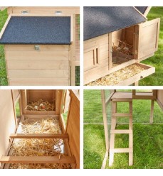 Do kurníka sa z výbehu dostanete pomocou rebríka. Celý domček a výbeh je vyrobený z kvalitného jedľového dreva a natretý lakom odolným voči poveternostným vplyvom a šetrným k životnému prostrediu. Pod kurníkom sa nachádza veľká výsuvná drevená zásuvka s pozinkovaným plechom, na ktorú padá trus, čím je zabezpečené jednoduché, rýchle a hygienické čistenie. V domčeku sú nainštalované aj tri drevené hniezda oválneho tvaru (hniezda), kde môžu sliepky odpočívať a spať. V prednej časti sa nachádzajú dvierka a zamrežované okno, ktoré dodávajú kurníku na kráse. Dvere sa však dajú otvoriť, napríklad na čistenie alebo chytanie sliepok. Takisto je možné otvoriť strechu pre ľahký prístup do kurína. Nad zásuvkou na trus sa nachádzajú malé posuvné dvierka, ktoré v prípade potreby zabezpečujú čerstvý vzduch (kvôli bezpečnosti sliepok sú vybavené pozinkovanou mriežkou). Na bočnej strane hniezda sa nachádza znáškový box, ktorý sa dá otvoriť zvonku na vybratie vajec alebo na vyčistenie. Celá strecha je chránená proti vlhkosti, dažďu a slnku kvalitným čiernym šindľom švédskej farby. Všetky otváracie mechanizmy sú kovové a pozinkované.
