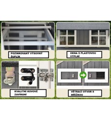 - Prémiové spracovanie s kolieskami na prepravu po záhrade, môže ho prenášať jedna osoba - kovová zásuvka na bobky, silný pozinkovaný plech zabudovaný v ráme - dvere sa dajú otvárať zvonku - odolné voči poveternostným vplyvom vyrobené z kvalitného, robustného borovicového dreva
