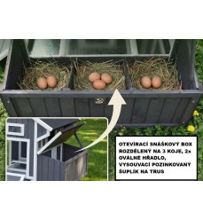 - ohrada vybavená silným pozinkovaným pletivom v ráme - natretá ekologickým a netoxickým lakom - rýchle čistenie vďaka výsuvnej kovovej zásuvke - čistenie hniezda jejednoduché - otváranie strechy zhora a jednoduchý zber vajec