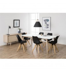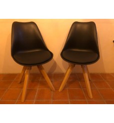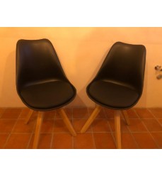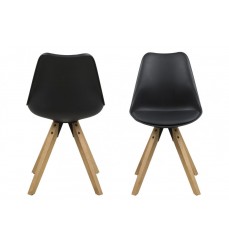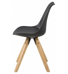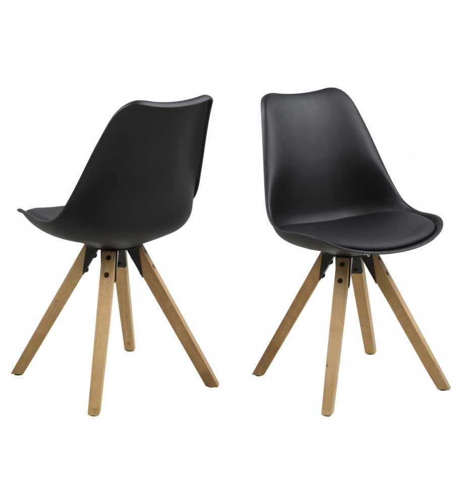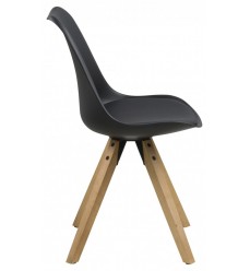 Kvalitná jedálenská stolička z čierneho plastu a ekokože. Nohy z prírodného dubového dreva - nosnosť 120 kg. Škandinávsky štýl. Rozmery: šírka 49 cm, hĺbka 55 cm, výška 85 cm.