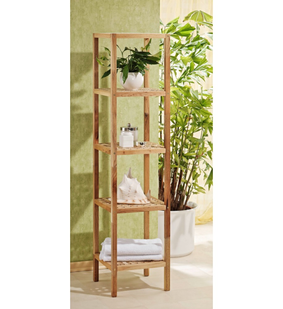 5 políc z masívneho olejovaného orechového dreva. Vo veľmi peknom sofistikovanom elegantnom dizajne. Rozmery: šírka 36 cm, hĺbka 36 cm, výška 150 cm. Ideálny do kúpeľne, spálne, kuchyne a predsiene.