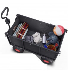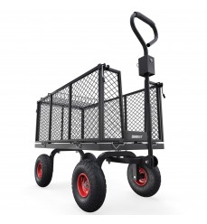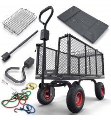 Kvalitný drôtený multifunkčný vozík s objemom 230 l vyrobený z robustnej ocele je ideálnym riešením na prepravu nákladu do 650 kg. Drôtené steny sa dajú sklopiť alebo úplne odstrániť na jednoduché vykladanie a nakladanie. Po odstránení sa vytvorí veľká ložná plocha na nakladanie ťažších nákladov. Tento vozík je ideálnym spoločníkom na všetky úlohy v záhrade na prepravu - nečistôt alebo lístia, na stavenisku, na farme alebo na ceste - k rybníku alebo na pláž. Vďaka veľkým kolesám je ideálnou voľbou aj do lesa na palivové drevo. Vnútorná plachta sa dá ľahko odstrániť, aby sa nezašpinila alebo neroztrhla, alebo naopak, aby z nej veci nevypadli.