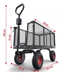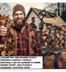 Vysokokvalitný pevný vozík s nosnosťou 650 kg, vhodný na všestranné použitie. V záhrade aj na cestách. Vydrží prepravu ťažších nákladov. Rozmery: šírka 115 cm, hĺbka 52 cm, výška 105 cm. Veľké nafukovacie kolesá s priemerom približne 26 cm.