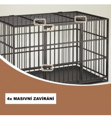 Domáci pevný koterec pre psa veľkosti ,,XXL-2" pre psa v byte alebo dome vyrobený z kvalitnej lakovanej ocele bez ostrých hrán. Môže sa používať aj ako prepravný box. Veľké predné otváracie dvierka sú zabezpečené dvoma západkami. Podlaha boxu sa dá jednoducho vysunúť, a tak ľahko a hygienicky vyčistiť alebo umyť vodou. Koterec má otváracie veko pre lepšiu interakciu so psom, takže dobre poslúži aj ako ohrádka. Ohrádka je vyrobená v Nemecku, čo zaručuje kvalitu výrobku.