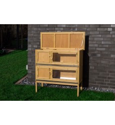Kvalitná králikáreň s dvoma prepojenými podlahami vyrobená z kvalitného borovicového dreva a pozinkovaného plechu. Rozmery: šírka 117 cm, hĺbka 45 cm, výška 115 cm.