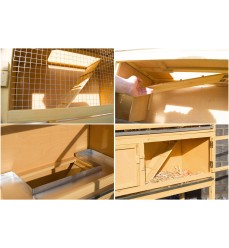 - dve poschodia - štyri predné dvierka, ktoré sa dajú zatvoriť západkou - otváracia strecha - oddelené koterce s domčekmi po stranách, ktoré zaručujú zvieraťu pokoj a súkromie - vnútorná rampa (dá sa sklopiť nahor a nadol) - dve vyberateľné pozinkované výsuvné zásuvky