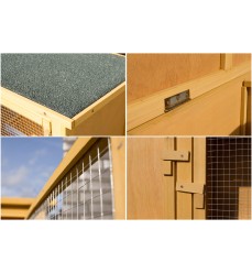 vyrobené z borovicového dreva - odolné voči poveternostným vplyvom s ekologickým lakom - strecha pokrytá zeleným asfaltovým šindľom - mriežka zarámovaná vo dverách (bez vyčnievajúcich ostrých koncov)