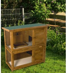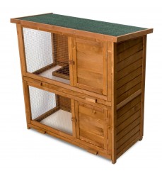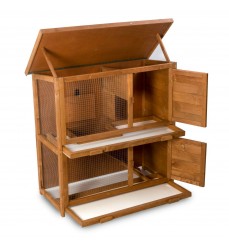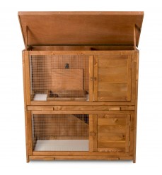 Kvalitná dvojposchodová králikáreň z borovicového dreva s dvoma kotercami. Koterce sa dajú oddeliť alebo spojiť zdvíhacou rampou. V kotercoch je dostatok priestoru na hranie a pocit bezpečia. Táto králikáreň urobí vašim domácim miláčikom radosť. Celá králikáreň je ošetrená bezpečnou a ekologickou hnedou farbou.