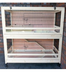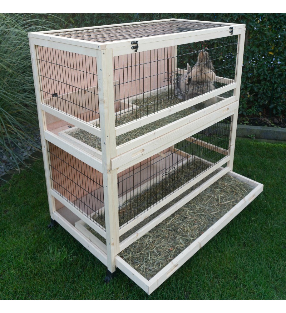 Kvalitná dvojpodlažná prepojená drevená králikáreň vhodná do interiéru aj exteriéru. Ponúka skutočné pohodlie pre vaše zvieratá. Spojenie zabezpečuje drevená rampa. Spojenie sa dá uzavrieť pomocou výklopných dvierok, takže zvieratá môžu zostať oddelené. Ponúka dostatok čerstvého vzduchu. Vysokokvalitné, pevné mreže chránia pred predátormi a zabraňujú prehrýzaniu. Králikáreň obsahuje jedny veľké dvere v kovovej mriežke na každom poschodí. Ďalší vchod do králikárne je zhora, kde sa dá odklopiť celé horné veko a dostať sa dovnútra. Krmivo alebo voda sa preto dajú jednoducho vložiť do králikárne. Pohodlne sa dostanete do každého kúta. Králikáreň je postavená na 4 kolieskach, čo zabezpečuje pohodlné premiestňovanie.