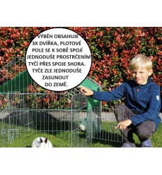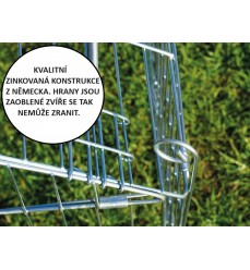 Kvalitný, pevný drôtený multifunkčný výbeh s rozstupom 3,5 cm je vhodný najmä pre kurčatá, ale rovnako dobre sa hodí aj pre králiky, morčatá, prepelice, sliepky a iné menšie zvieratá. Výbeh je vyrobený zo silného pozinkovaného nerezového drôtu bez ostrých hrán vo vynikajúcom spracovaní. Nemusíte sa teda obávať, že by sa zviera zranilo. Je ľahko rozšíriteľný, t. j. môžete si ich kúpiť viac a umiestniť ich za seba alebo vedľa seba a zväčšiť tak celý priestor na pasenie alebo ohradu. Montáž je veľmi jednoduchá, prestrčením tyčí cez spoje je hotová za niekoľko minút, zároveň keď ju nepotrebujete používať, jednoducho ju zložíte do placky a schováte.