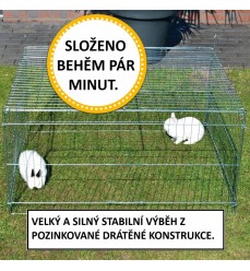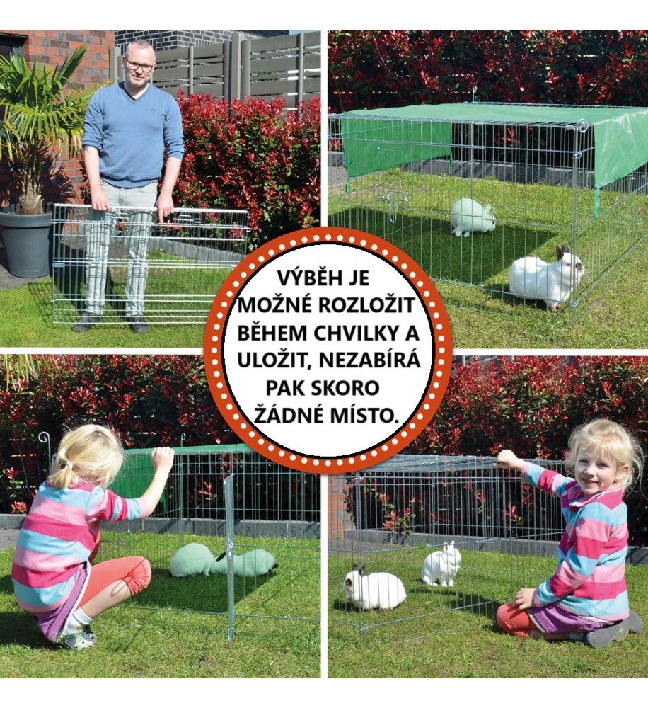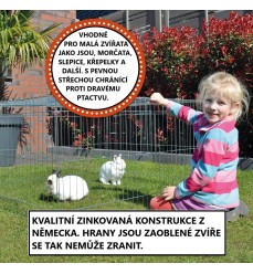 Kvalitný, pevný drôtený multifunkčný výbeh s rozstupom 3,5 cm je vhodný najmä pre kurčatá, ale rovnako dobre sa hodí aj pre králiky, morčatá, prepelice, sliepky a iné menšie zvieratá. Výbeh je vyrobený zo silného pozinkovaného nerezového drôtu bez ostrých hrán vo vynikajúcom spracovaní. Nemusíte sa teda obávať, že by sa zviera zranilo. Je ľahko rozšíriteľný, t. j. môžete si ich kúpiť viac a umiestniť ich za seba alebo vedľa seba a zväčšiť tak celý priestor na pasenie alebo ohradu. Montáž je veľmi jednoduchá, prestrčením tyčí cez spoje je hotová za niekoľko minút, zároveň keď ju nepotrebujete používať, jednoducho ju zložíte do placky a schováte.