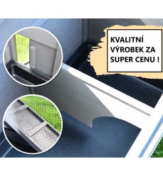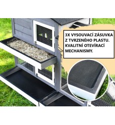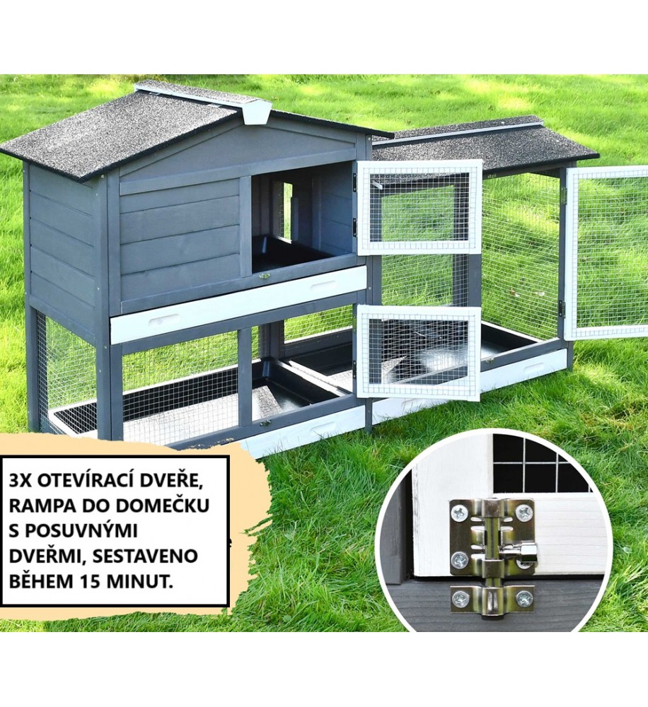 Súčasťou je 3x vysoká výsuvná zásuvka na trus na jednoduché čistenie. Zásuvka je vybavená pozinkovaným plechom, aby sa zabránilo zničeniu dreva. Na dvierka môžete pripevniť fľašu na vodu. Strecha je otvárateľná a má asfaltové panely, ktoré chránia králikáreň pred dažďom, vlhkosťou a krupobitím. Drevo je natreté ekologickým lakom odolným voči poveternostným vplyvom. Pozinkovaný drôt je odolný a robustný.