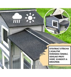 Dvoje dvierka vo výbehu vám zabezpečia prístup do každého kúta. Do domčeka vedie široká drevená rampa, ktorú možno v noci uzavrieť posuvnými dverami, aby boli vaše zvieratá v bezpečí a v teple. Domček má jedny otváracie dvere a tiež otváraciu strechu, takže sa ľahko dostanete do každého kúta.