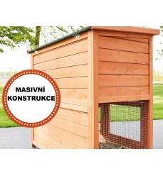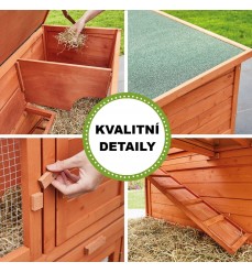 Súčasťou je 2x výsuvná zásuvka na trus na jednoduché čistenie. Zásuvka je vybavená pozinkovaným plechom, aby sa zabránilo zničeniu dreva. Na dvierka môžete pripevniť fľašu na vodu. Strecha je otvárateľná a má asfaltové panely, ktoré chránia králikáreň pred dažďom, vlhkosťou a krupobitím. Drevo je natreté ekologickým lakom odolným voči poveternostným vplyvom. Pozinkovaný drôt je odolný a robustný.