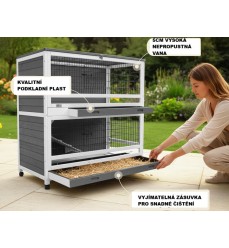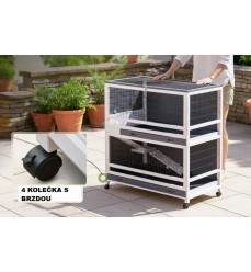 Dizajnová sivo-biela, vnútorná králikáreň z vysušeného jedľového dreva, vhodná pre králiky, morčatá a iné drobné hlodavce.Mobilná na brzdených kolieskach, môže byť aj vonku - ideálne chránená pred dažďom.