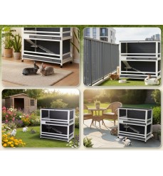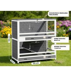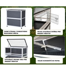 Kvalitná dizajnová dvojpodlažná prepojená drevená králikáreň vhodná do interiéru aj exteriéru. Ponúka skutočné pohodlie pre vaše zvieratá. Spojenie zabezpečuje drevená rampa. Prepojenie sa dá uzavrieť výklopnými dvierkami, takže zvieratá môžu zostať oddelené. Ponúka dostatok čerstvého vzduchu. Vysokokvalitné, pevné tyče chránia pred predátormi a zabraňujú prehrýzaniu. Králikáreň obsahuje jedny veľké dvere v kovovej mriežke na každom poschodí. Ďalší vstup do králikárne je zhora, kde sa dá odklopiť celé horné veko, aby sa dalo dostať dovnútra. Krmivo alebo voda sa preto dajú jednoducho vložiť do králikárne. Ľahko sa dostanete do každého rohu. Králikáreň je postavená na 4 brzdených kolieskach, ktoré zabezpečujú pohodlné premiestňovanie.