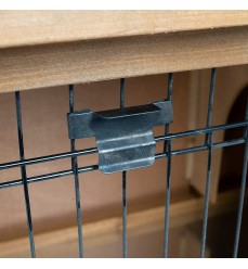 Králikáreň sa otvára dvomi drevenými dvierkami. Okrem toho sa dá otvoriť aj celá strecha, čo umožňuje rýchle a jednoduché čistenie. Drevené západky na dverách a kovový zatvárací mechanizmus na mriežke zabezpečujú bezpečné zatvorenie.