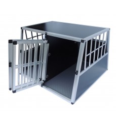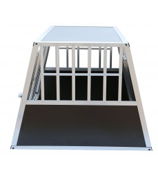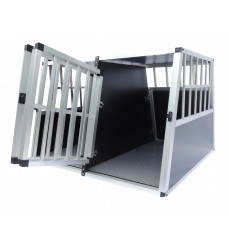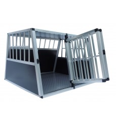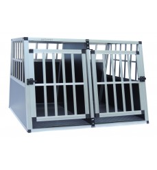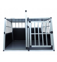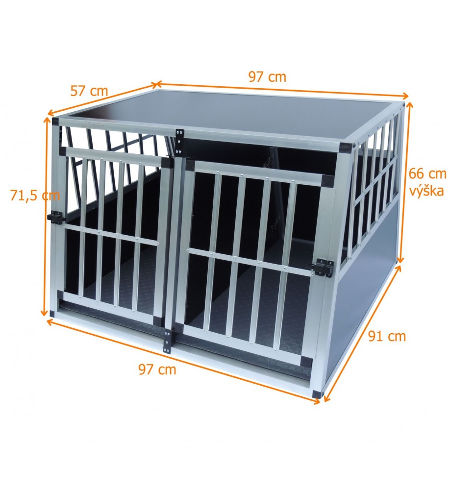 Hliníkový dvojitý prepravný box pre dvoch väčších psov s prepážkou. Obojstranný šikmý je ideálnym pomocníkom pri bezpečnej preprave vášho domáceho miláčika autom. Ideálne, jednoduché a ľahké umiestnenie do kufra vďaka šikmej zadnej časti.