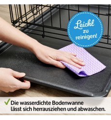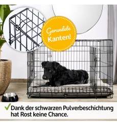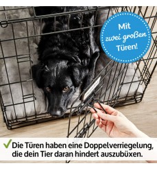 Robustná železná klietka so zaoblenými rohmi je bezpečná a zaujme svojou dlhou životnosťou. Veľké predné a bočné dvierka umožňujú zvieraťu rýchly vstup a výstup. Dvierka majú dvojitý zatvárací mechanizmus, ktorý zabraňuje úniku zvieraťa - váš pes je tak v bezpečí. Vodotesná plastová, tvrdená vaňa je vyrobená z vysokokvalitného materiálu. Vaňu možno ľahko vytiahnuť a vyčistiť.