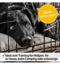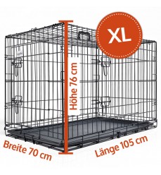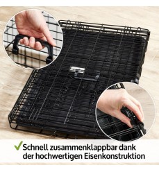 Skladací box veľkosti XL pre majiteľov domácich zvierat slúži ako prístrešok a úkryt pre psy, mačky a malé zvieratá. Ideálny na výcvik šteniat doma, pri kempovaní alebo cestovaní autom. Box je vybavený pevnými železnými tyčami a vďaka svojej kompaktnej konštrukcii je mimoriadne stabilný. Čierny práškový náter zabráni vzniku hrdze.