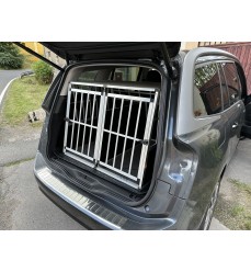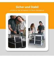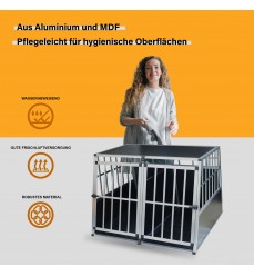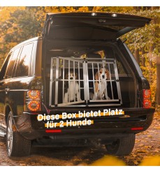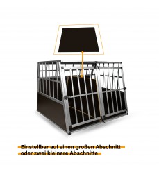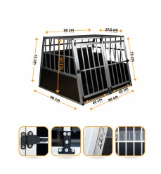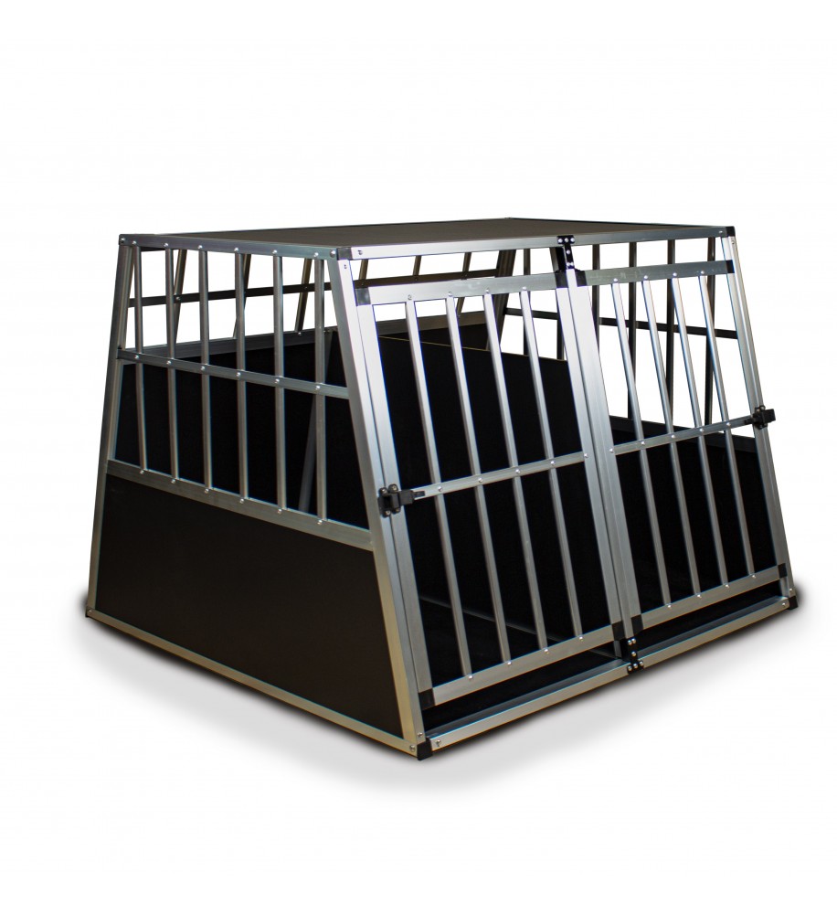 Hliníkový dvojitý prepravný box pre dvoch väčších psov s odnímateľnou prepážkou. Obojstranný šikmý je ideálnym pomocníkom pri bezpečnej preprave vášho domáceho miláčika autom. Ideálne, jednoduché a ľahké umiestnenie do kufra vďaka šikmej zadnej časti.