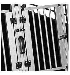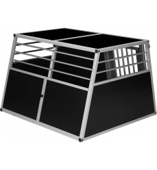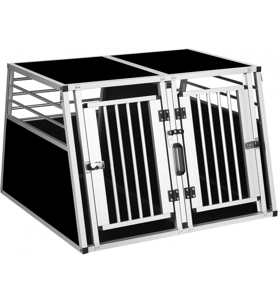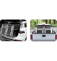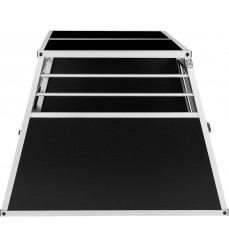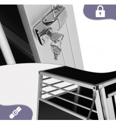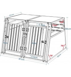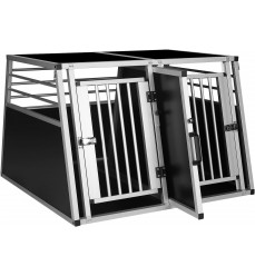 Prémiový pevný hliníkový dvojitý prepravný box pre dvoch väčších psov s prepážkou, ktorú možno zvonku ľahko odstrániť. Priečka je konštruovaná až po strop. Obojstranný šikmý je ideálnym pomocníkom pri bezpečnej preprave vášho domáceho maznáčika autom. Ideálne, jednoduché a ľahké umiestnenie do kufra vďaka zadnému bočnému skoseniu. Možno ho použiť aj ako koterec alebo búdku pre domáce zviera do bytu alebo domu.