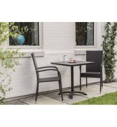 Štvorcový stôl Corfu so stabilnou konštrukciou a odolnou doskou z umeleckého dreva je vhodný do záhrady, na terasu, ale aj do kaviarní a reštaurácií.